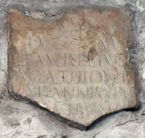 - D(is) M(anibus) / L(ucius) Aurelius E/pagathioni / vixit annis XXV / [me]nsibus VI / [fecit m]a[ter / filio piissimo b(ene) m(erenti)]