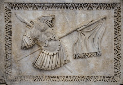 Rechteckige Platte mit Waffen: Brustpanzer mit Lanze, Fahne. Um das Bildfeld Profilrahmen mit Kymation (Ikonographie wie Nr. 35134).