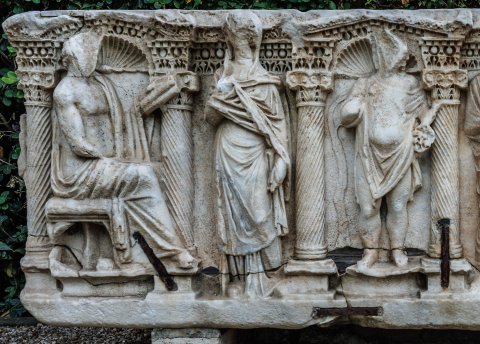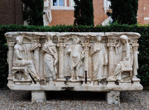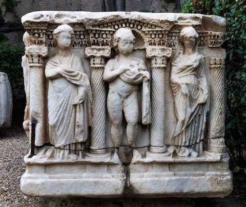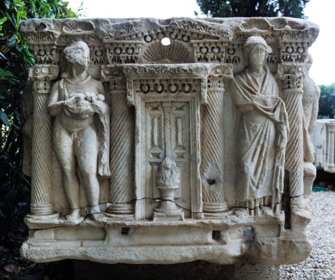 Vorderseite: zwischen Säulen mit Spiralkannelur fünf Nischen, die seitlichen mit Bogenabschluss, die mittlere mit Giebel, alle mit Muschelbaldachin. Die zwei restlichen Nischen mit geradem Gebälk. In der Mitte auf Podest stehender kindlicher Knabe in kurzem hemdartigen Gewand, in der linken Hand Blumen (?), an seiner rechten Seite Baum. In der Nische rechts stehender Mann im Mantel, in der Nische links stehende Frau im Typus Großer Herculanenserin. In den seitlichen Nischen links sitzender Mann im Mantel, in der Linken volumen; rechts auf Klappstuhl sitzende Frau mit über den Kopf gezogenem Mantel.