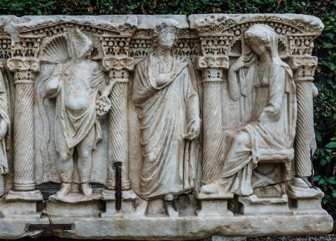 Auf der rechten Schmalseite in der Mitte stehender Knabe, nackt bis auf Mantel über linkem Arm, im Mantelbausch Früchte, auf der rechten Schulter Fibel. In den seitlichen Nischen je eine stehende Frau.