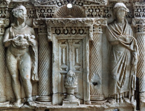 Auf den Schmalseiten jeweils drei Nischen zwischen Säulen mit Spiralkannelur. Auf der linken Schmalseite in der Mitte Flügeltür, darüber Muschelbaldachin unter Giebel, vor der Tür Rundaltar mit Feuerflammen; in den seitlichen Nischen links stehender Knabe, nackt bis auf Mantel mit Scheibenfibel auf der rechten Schulter, im Mantelbausch Früchte; rechts stehende Frau.