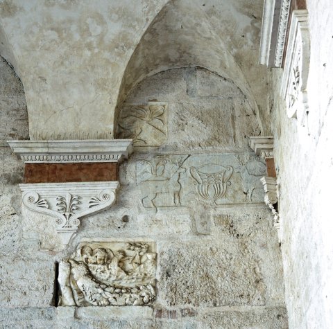 - Girlandensarkophag: links noch Bein eines Eroten, der eine Girlande mit Früchten trägt. Im Girlandenbogen Mythos (?): auf Felsen sitzender geflügelter Jüngling, neben ihm Mann nach rechts gewandt, in der ausgestreckten Hand Schwertscheide; Baum mit Früchten, darunter abgewinkeltes Bein (?) einer sonst zerstörten liegenden Person ?