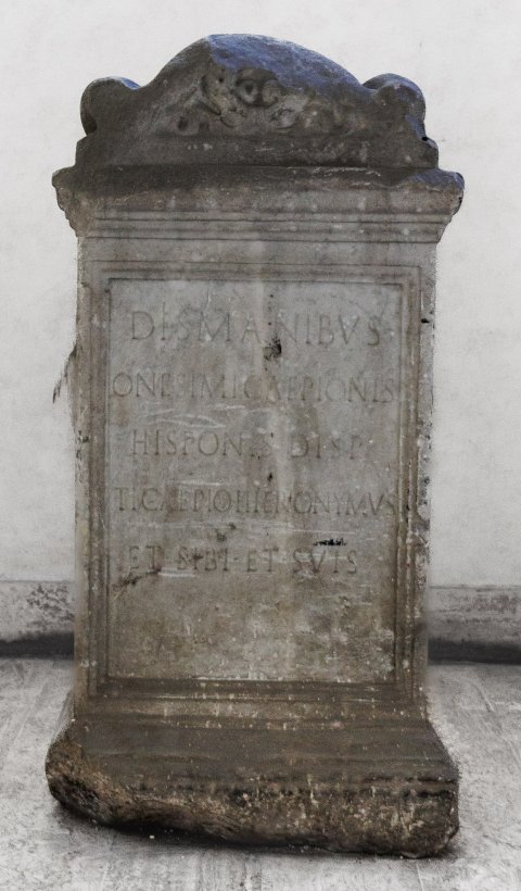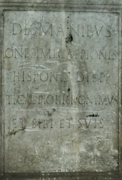 - Dis Manibus / Onesimi Caepionis / Hisponis disp(ensatoris) / Ti(berius) Caepio Hieronymus / et sibi et suis