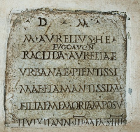 - D(is) M(anibus) / M(arcus) Aurelius He/raclida evoc(atus) Aug(usti) n(ostri) Aureliae / Urbanae pientissi/mae et amantissim(ae) / filiae memoriam posu/it vixit ann(os) III mens(es) IIII