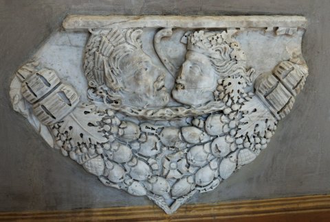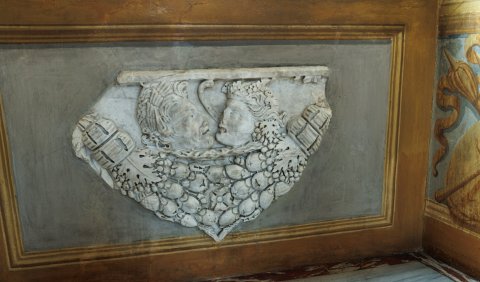- Fruchtgirlande, im Girlandenbogen zwei dionysische Köpfe im Profil (links Satyr, rechts Mänade mit Weinlaubkranz)