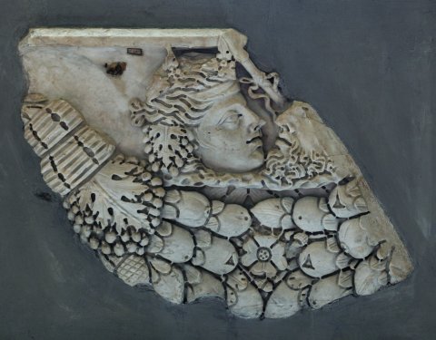 - Fruchtgirlande, im Girlandenbogen zwei dionysische Köpfe im Profil (links Mänade mit Weinlaubkranz, rechts bärtiger Satyr, dazwischen Thyrsusstab)