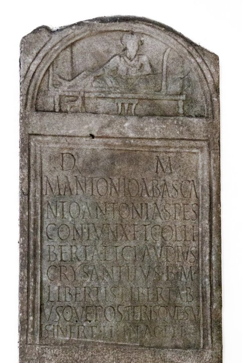- D(is) M(anibus) / M(arci) Antonio Abasca/nto Antonia Spes / coniunx et colli/berta et Claudius / Crysanthus b(ene) m(erenti) / libertis libertab/usque posterisque su/is in fr(onte) p(edes) II in ag(ro) p(edes) II