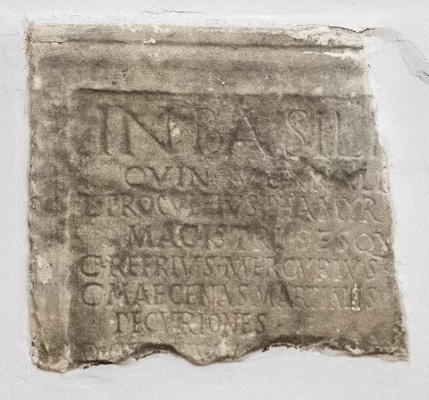 - In basili[ca convenerunt] / quinquennali[s] / L(ucius) Proculeius Thamyr[as] / magistri sesqu[iplicares] / C(aius) Refrius Mercurius / C(aius) Maecenas Martialis / decuriones / Q(uintus) Ce[---]ius A[---