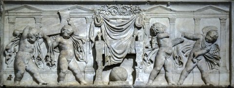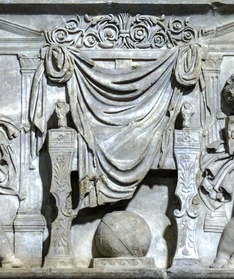 - Im Zentrum mit einem Tuch bedeckter leerer Thron mit Fußschemel, auf diesem Globus. Seitlich je zwei Eroten, links mit Sichel, rechts mit Szepter des Saturn. Im Hintergrund Architektur (Podest, darauf kannelierte Pfeiler, die Gebälk und vier Giebel tragen).