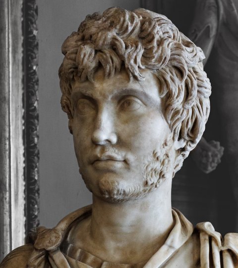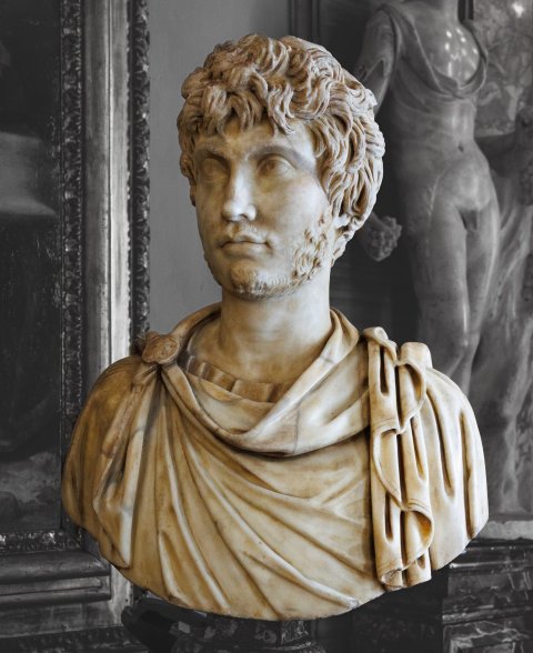 - Porträt eines jungen Mannes mit gesträhnten Locken und Bart. Mantel mit Scheibenfibel auf der rechten Schulter.