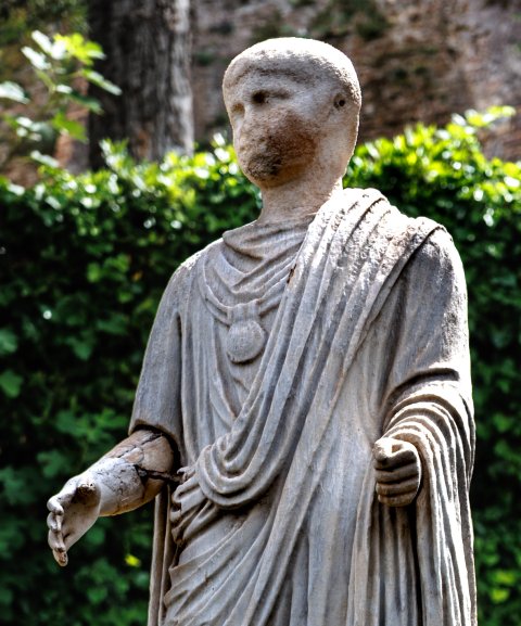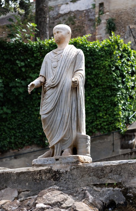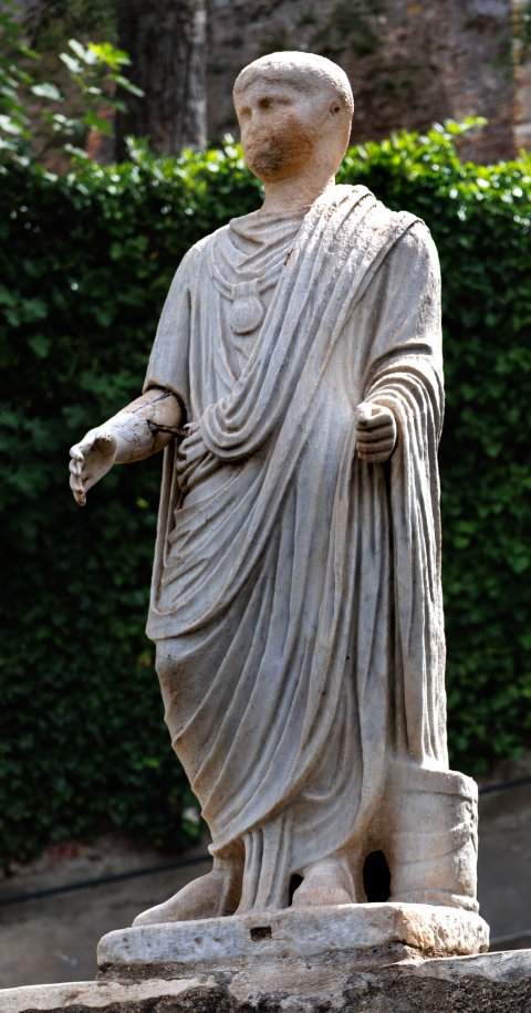 - Stehender Togatus mit Bulla, bartloser Kopf (zugehörig ?); neben dem linken Fuß Rollenbehälter.