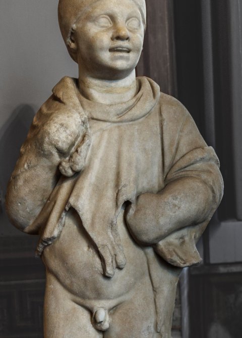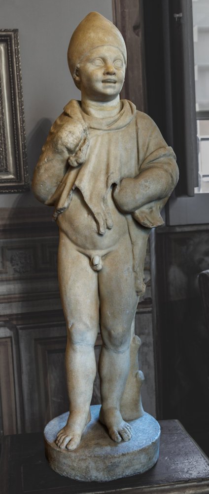 - stehender Knabe mit Tierfell (Löwenfell ?) um Schultern und Arme. Kopf mit spitzer Mütze nicht zugehörig.