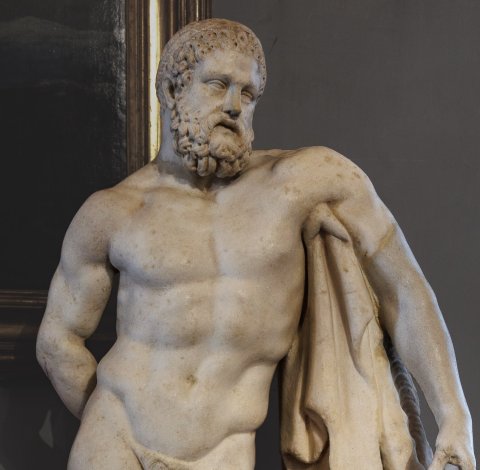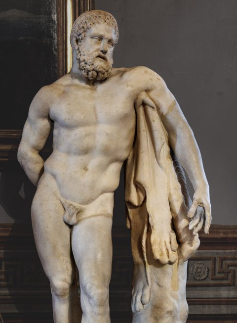 - Mythische Figur: auf die Keule gestützter ausruhender Hercules, Typus Farnese. Nachbildung nach einer Statue des Lysipp, 4. Jh. v. Chr.