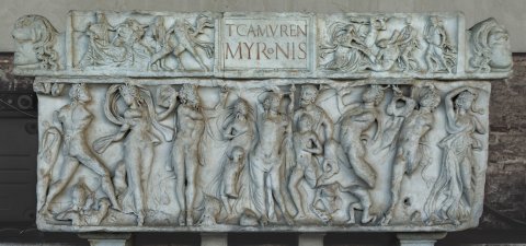 Deckelvorderseite mit Schrifttafel in der Mitte, flankiert von Reliefs. Links mythische Figuren; rechts Pentheus und vier Mänaden.