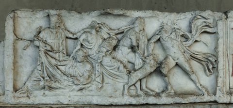 Auf den Schmalseiten jeweils zwei liegende Panther, zwischen ihnen Widderkopf. An den Ecken der Vorderseite weibliche Köpfe als Akrotere. - Inschrift