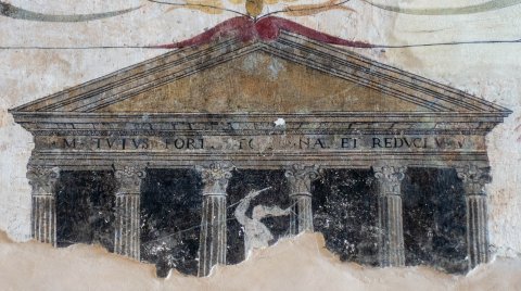 - Bauinschrift am Gebälk der Tempelfront, darunter facettierter Architrav