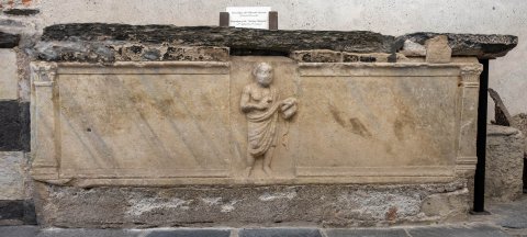 - Vorderseite begrenzt durch zwei Pilaster mit korinthischen Kapitellen, mittig in Nische stehender Philosoph mit Mantel, in der Linken Schriftrolle (volumen), die Rechte zeigt darauf.