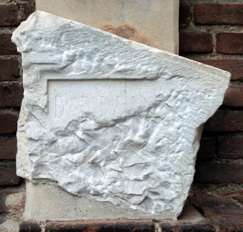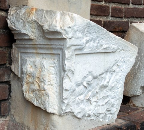 - nur obere Hälfte erhalten, stark bestoßen, oben und rechts abgearbeitet