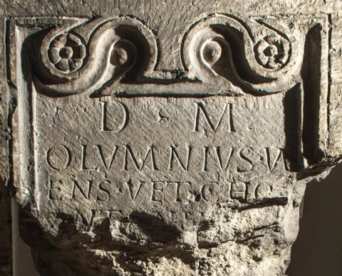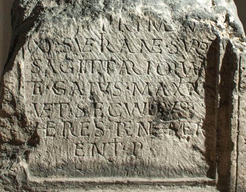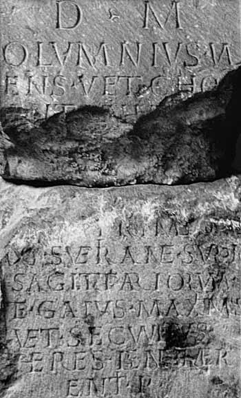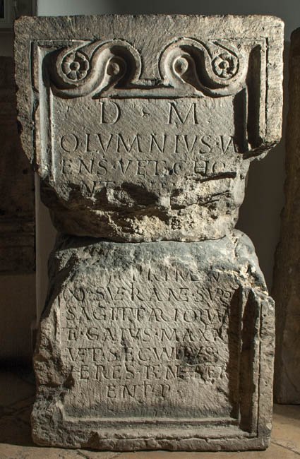 - D(is) M(anibus) / Olumnius Val/ens vet(eranus) c(o)ho(rtis) I / Ant(oninae) |(miliariae) He[mes]/[enorum ---] / [------] / [------] / c(o)[ho(rtis)] prim(a)e Nov(a)e / |(miliariae) Severian(a)e Surorum / sagittariorum / et Gaius Maximus / vet(eranus) secundus / heres bene mer/enti p(osuerunt)