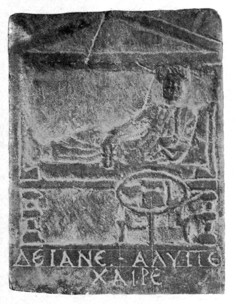- Bankettszene (Totenmahl): rechteckiges Feld mit Giebel darüber; im Feld: auf Kline liegende Figur mit langem Gewand, in der rechten Hand Kranz, in der linken Trinkgefäß, vor sich dreifüßiger runder Tisch mit mehreren Gefäßen und Schöpfer.
