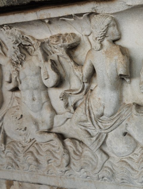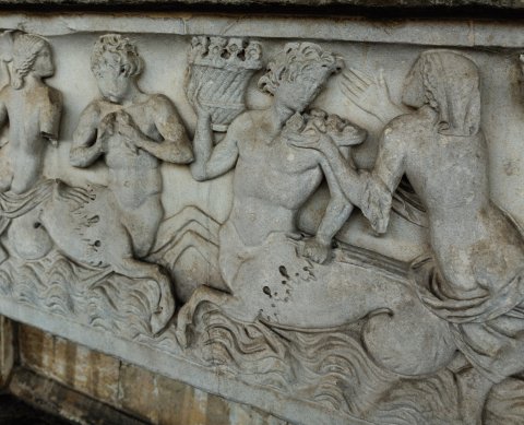 Thiasos mit Meerwesen. Auf der Vorderseite je zwei sich aufeinander zu bewegende Seekentauren mit Nereiden; drei Kentauren spielen ein Musikinstrumt (Lyra, Doppelflöte, Muschelhorn), der vierte trägt einen Korb mit Blumen.