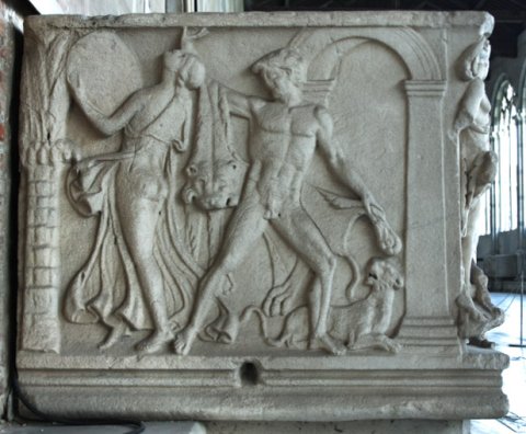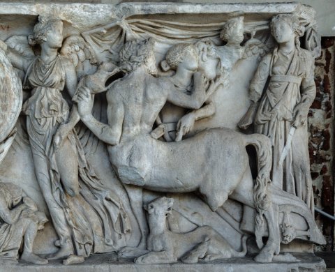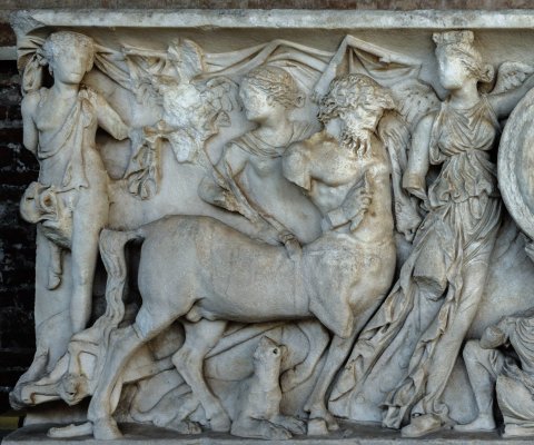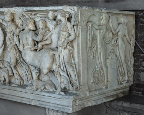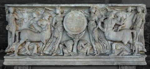 Mythische Figuren: auf der Vorderseite in der MItte Clipeus mit Inschrift, getragen unten von einer Palme, seitlich von dieser sitzende Gefangene. Zu Seiten des Clipeus Victorien, anschließend Kentaur, der einen zweirädrigen Wagen zieht; im rechten Wagen Semele, im linken Dionysos mit Nebris. Hinter den Kentauren rechts Mänade, links Satyr. Im Hintergrund Draperie und Eroten. Unter den Kentauren liegende Panther.