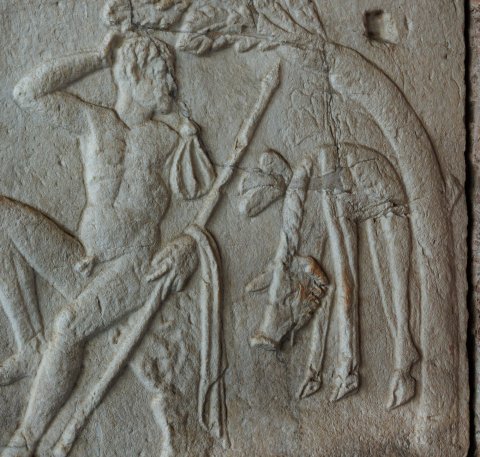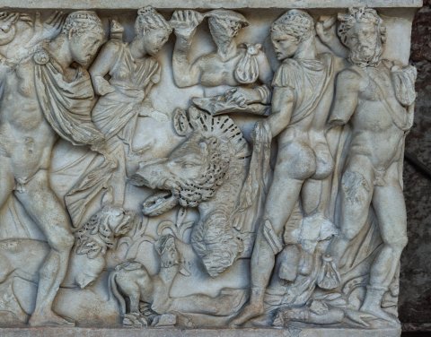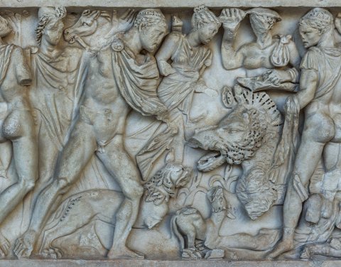 Mythos. Auf der Vorderseite kalydonische Eberjagd mit Meleager, Atalante, Dioskuren, Artemis.