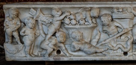 - Mythische Figuren: kindliche nackte geflügelte Eroten beim Ernten und Verarbeiten von Früchten; links an und auf einem Fruchtkorb, in der Mitte gestürzter Erot vor einem Korb mit Schlange, weiter rechts Eroten an einem Bottich, darunter zwei berauschte (?) Eroten am Boden; im Hintergrund auftauchender bärtiger Mann im Mantel (Herme ?), ganz rechts zwei Eroten mit Werkzeug (?).