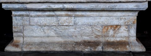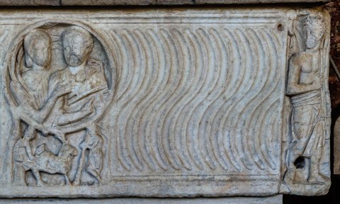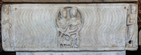Auf der Vorderseite Riefeln, in der Mitte Medaillon (Clipeus) mit zwei Porträtbüsten (Ehepaar); Mann in toga contabulata, Frau mit Scheitelzopffrisur. Darunter Schaf und zwei Hirten.