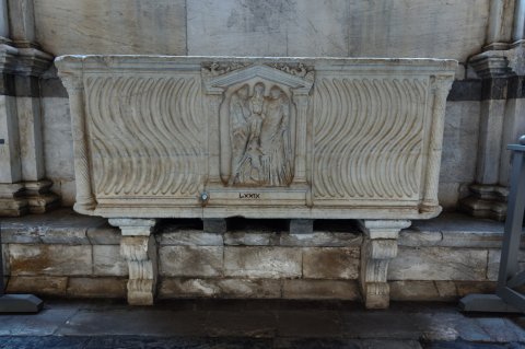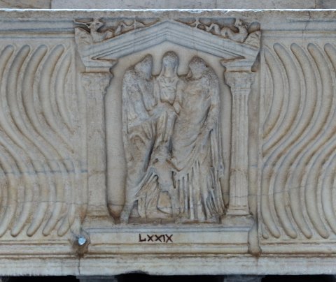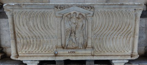 - Auf der Vorderseite zwischen den Riefelfeldern Giebelnische mit Säulen, darin Ehepaar, dazwischen im Hintergrund Concordia, vor ihnen Erot. Auf den Giebelschrägen Tritone mit Muschelhorn. An den Ecken Säule mit Spiralkannelur.
