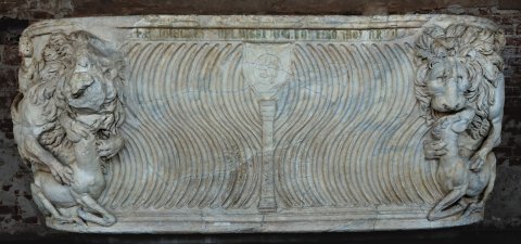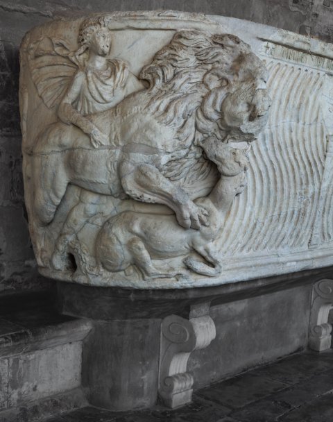 Wannenförmiger Riefelsarkophag, auf der Vorderseite zwischen den Riefeln Rankenpilaster, darauf mittlelalterliches Wappenschild mit heraldischem Rautier.