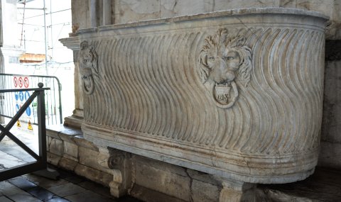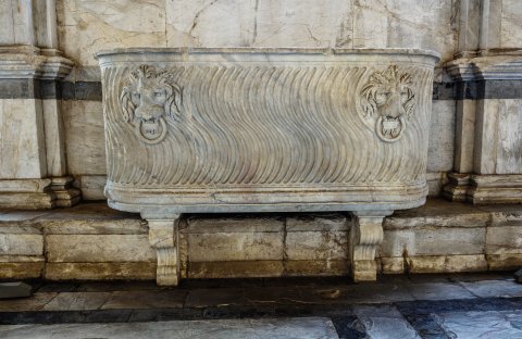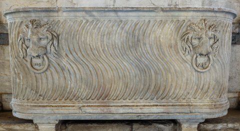 - Wannenförmiger Riefelsarkophag, auf der Vorderseite zwei Löwenköpfe mit Ringen im Maul.