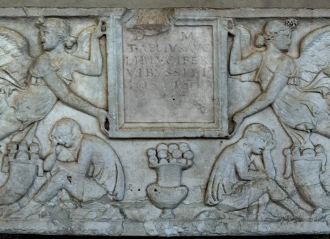 Auf der Vorderseite rechteckige gerahmte Schrifttafel, getragen von zwei schwebenden Victorien, unter der Tafel Gefäß mit Früchten, seitlich davon auf dem Boden sitzende trauernde Jünglinge (Diener), vor ihnen Füllhorn. Ganz außen Erot mit Girlande.