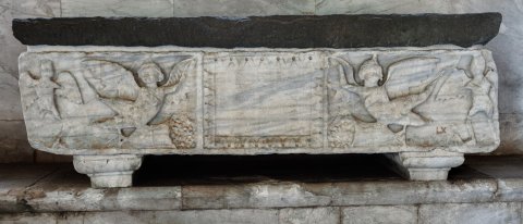 35846 Sarkophag mit Schrifttafel zwischen Eroten