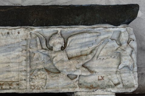 - Mythische Figuren: Auf der Vorderseite leere, mit Kymation gerahmte Tafel, gehalten von zwei schwebenden Eroten, unter ihnen je ein umgestürztes Gefäß mit Früchten (?). An den Ecken je ein kleinerer, zur Mitte hin bewegter Erot.
