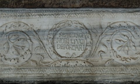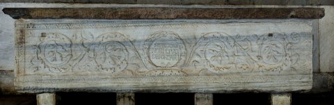 - Vorderseite mit Kymation gerahmt. Akanthus-Spiralranke, in der Mittel Kranz mit Inschrift.