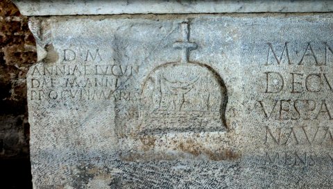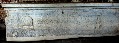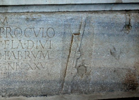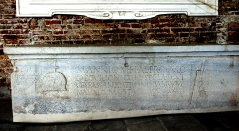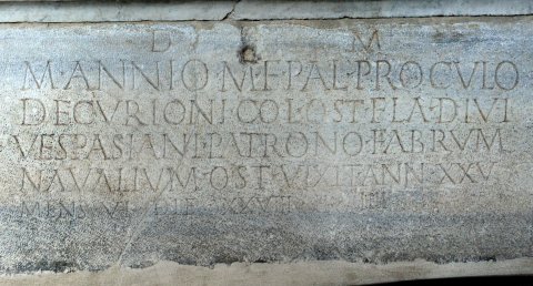 - D(is) M(anibus) / M(arco) Annio M(arci) f(ilio) Pal(atina) Proculo / decurioni col(oniae) Ost(iensis) fla(mini) divi / Vespasiani patrono fabrum / navalium Ost(iensium) vixit ann(os) XXV / mens(es) VI die(s) XXVIII h(oras) IIII // D(is) M(anibus) / Anniae Iucun/dae M(arci) Anni / Proculi matris