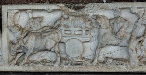 Zentrales ovales Medaillon ohne Inschrift, flankiert von nach außen bewegten Männern mit flatterndem Mantel und kurzer Tunica. Im erhaltenen linken Teil folgen ein Baum und Hund, ein Reiter, ein zweirädriger Karren mit vergittertem Aufbau, Ochsengespann mit Treiber.