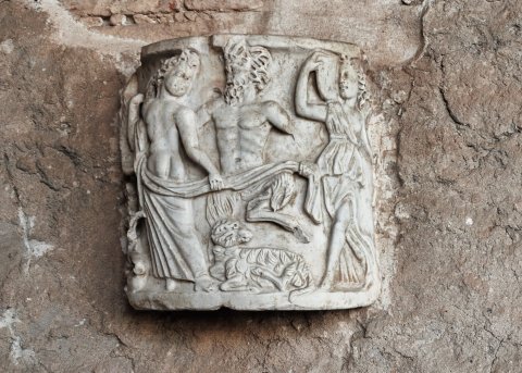 - Mythos: Thiasos, Pan mit liegender Ziege zwischen zwei Mänaden