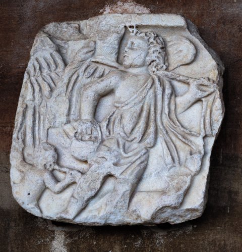 - Mythische Figuren. Geflügelter Erot in kurzer Tunica, schultert Stab mit Korb, in der rechten Hand Henkelkor, neben ihm Tier. Links unten Triton mit Muschelhorn, darüber Reste von Flügeln; rechts Spuren des Rahmens eines Clipeus ?