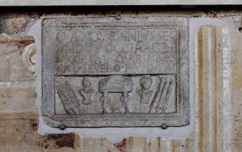 - V(iventes) f(ecerunt) / Q(uintus) Anquirinnius Sec/undus Occia Agile / uxor Q(uinto) Anquirinnio / Gal(eria) Severo Q(uinti) f(ilio) VI(viro) d(ecurionum) s(ententia) f(acto?) / an(num) d(ies) XV // Sibi et sui(s) p(osteris)que