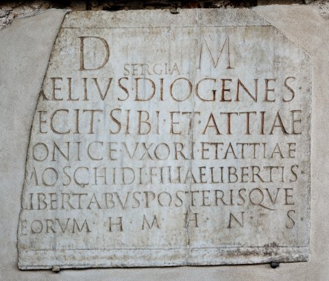 - D(is) M(anibus) / [P(ublius) A]elius / Sergia / Diogenes / [f]ecit sibi et Attiae / [I]onic(a)e uxori et Attiae / Moschidi filiae libertis / libertabusque posterisque / eorum h(oc) m(onumentum) h(eredem) n(on) s(equetur)