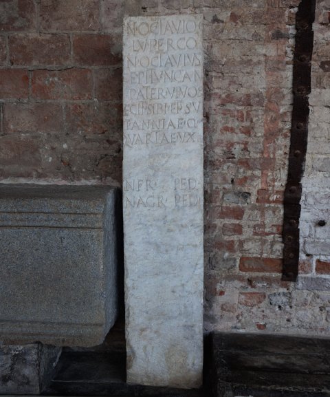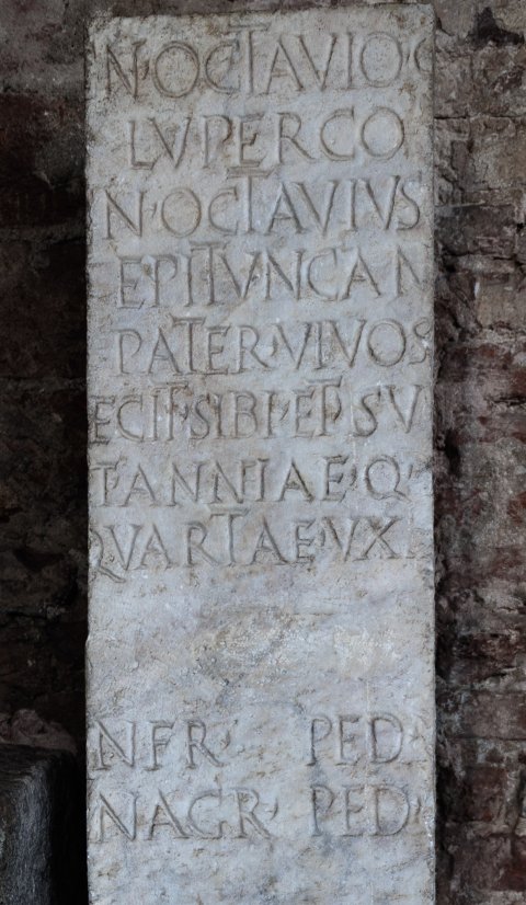 - Cn(aeo) Octavio C[n(aei) f(ilio)] / Luperco / Cn(aeus) Octavius [---] / Epituncan[us] / pater vivos(!) / [f]ecit sibi et sui[s] / [e]t Anneiae Q(uinti) [---] / Quartae ux/{s}[ori] / [i]n fr(onte) ped(es) X / [i]n agr(o) ped(es) X