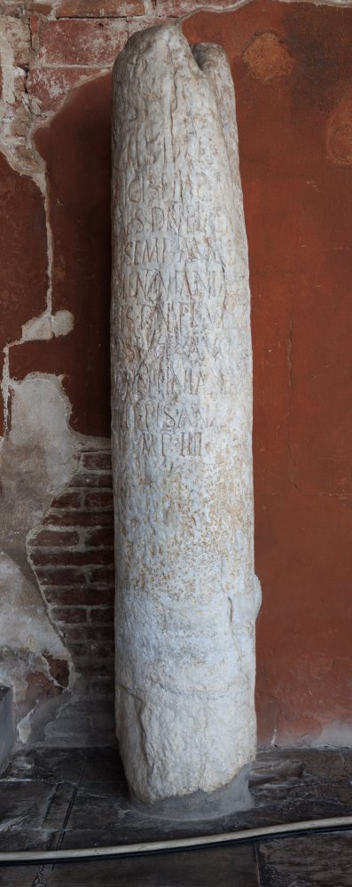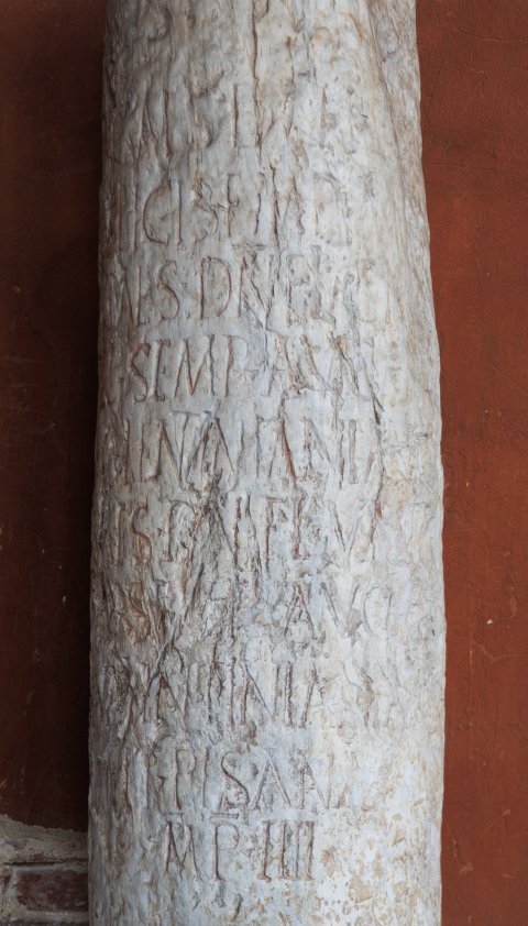 - Imp(eratori) Caes(ari) d(omino) n(ostro) F[l](avio) [Valent]i / Pio Felici semp(er) A[ug(usto)] / Imp(eratori) Caes(ari) d(omino) n(ostro) Fl(avio) Gr[atia]no / Pio Fel(ici) semp(er) Aug(usto) / divi Valentiniani Aug(usti) filio / [Im]p(eratori) Caes(ari) d(omino) n(ostro) Fl(avio) Valentiniano / [Pi]o F(e)l(ici) semp(er) Aug(usto) / divi Valentiniani Aug(usti) filio / civit(as) Pisana / m(ilia) p(assuum) IIII