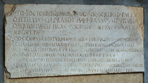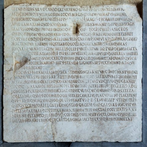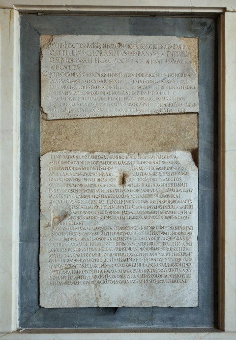 - [A(nte)] d(iem) XIII K(alendas) Octobr(es) Pisis in foro in Augusteo scrib(endo) adfuer(unt) / Q(uintus) Petillius Q(uinti) f(ilius) P(ublius) Rasinius L(uci) f(ilius) Bassus M(arcus) Pupius M(arci) [f(ilius)] / Q(uintus) Sertorius Q(uinti) f(ilius) Pica Cn(aeus) Octavius Cn(aei) f(ilius) Rufus A(ulus) Albiu[s] /A(uli) f(ilius) Gutta / quod C(aius) Canius C(ai) f(ilius) Saturninus IIvir v(erba) f(ecit) de augendis honoribus / L(uci) Caesaris Augusti Caesaris patris patriae pontificis maximi / tribuniciae potestatis XXV fili(i) auguris consulis designati princip[is] / iuventutis patroni coloniae nostrae q(uid) d(e) e(a) r(e) f(ieri) p(laceret) d(e) e(a) r(e) i(ta) c(ensuerunt) / cum senatus populi Romani inter ceteros plurimos ac max{s}imos / honores L(ucio) Caesari{s} Augusti Caesaris patris patriae pontificis maximi tribu/niciae potestatis XXV filio auguri consuli designato per / conse(n)sum omnium ordinum studio [---] / [---]SINTROLVN[---] / [---]tetur data cura C(aio) Canio Saturnino IIvir(o) et decem primis elig[endi] / aspiciendique uter eorum locus magis idoneus videatur emendi[que] / publica pecunia a privatis eius loci q[ue]m magis probaverint utique apud eam aram quod annis a(nte) d(iem) X[III K(alendas) Sept(embres) p]ublice Manibus eius per magis/tratus eosve qui ibi iure dicendo pr[aee]runt togis pullis amictos / quibus eorum ius fasque erit eo die [eiu]s vestis habendae inferiae mit/tantur bosque et ovis atri infulis caerulis infulati di{i}s Manibus ei(us) / mactentur eaeque hostiae eo loco adoleantur superque eas / singulae urnae lactis mellis olei fundantur ac tum demum facta(m) / c[eteris p]otestatem si qui privatim velint Manibus eius inferias mitter[e] / [nive quis] amplius uno cereo unave face coronave mittat dum ii qui im/[molaver]int cincti <G=C>abino ritu struem lignorum succendant adque / [peri]nde habeant [uti] locus ante eam aram quo ea strues congerantur conponantur pate(at) / [q]uoqu<o=E>versus pedes XL stipitibusque robustis saepiatur lignorumque / acervos eius rei gratia quod annis ibi constituatur cippoque grandi / secundum aram defixso hoc decretum cum superioribus decretis ad ei(us) / honores pertinentibus incidatur insculpaturve nam quod ad cetera / sollemnia quae eodem illo die vitari caverive placuissent placerent/que id sequendum quod de iis senatus p(opuli) R(omani) censuisset utique prim(o) / quoque tempore legati ex nostro ordine Imp(eratorem) Caesare(m) Augustum / patrem patriae pontificem maximum tribinicae potestatis XXV / adeant petantque ab eo uti colonis Iuliensibus coloniae Opsequenti(s!) / Iuliae Pisanae ex hoc decreto ea om(n)ia facere exsequique permittat