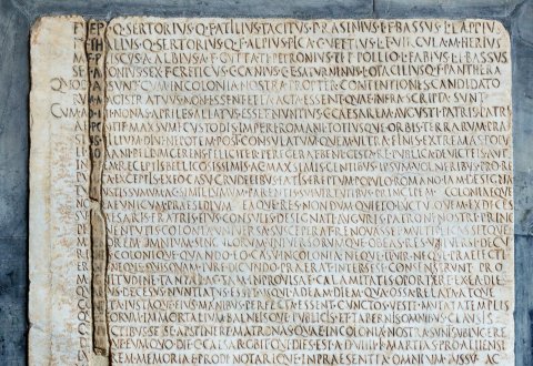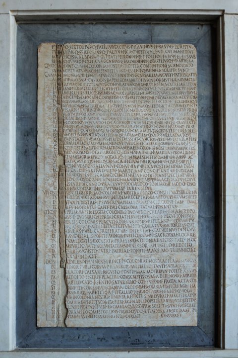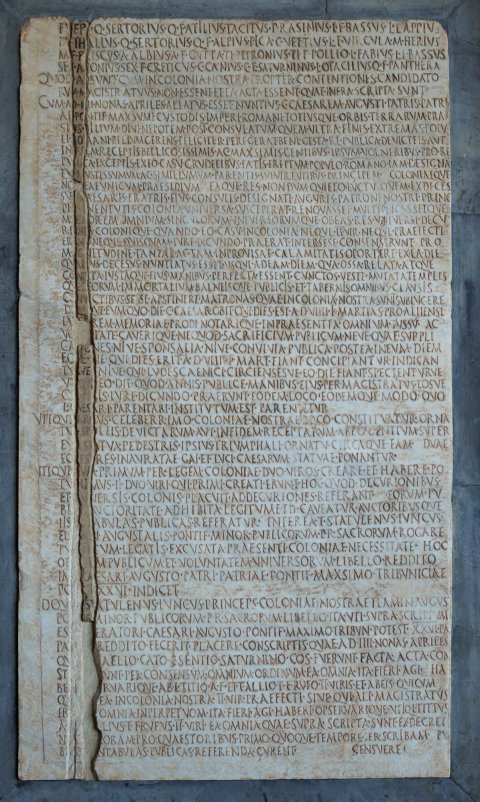 - scrib(endo) ad]/fu[e]r(unt) Q(uintus) Sertorius Q(uinti) f(ilius) Atilius Tacitus P(ublius) Rasinius L(uci) f(ilius) Bassus L(ucius) Lappius / P(ubli) [f(ilius) G]allus Q(uintus) Sertorius Q(uinti) f(ilius) Alpius Pica C(aius) Vettius L(uci) f(ilius) Virgula M(arcus) Herius / M(arci) [f(ilius) P]riscus A(ulus) Albius A(uli) f(ilius) Gutta Ti(berius) Petronius Ti(beri) f(ilius) Pollio L(ucius) Fabius L(uci) f(ilius) Bassus / Sex(tus) [A]ponius Sex(ti) f(ilius) Creticus C(aius) Canius C(ai) <f=E>(ilius) Saturninus L(ucius) Otacilius Q(uinti) f(ilius) Panthera / quod [v(erba) f(acta)] sunt cum in colonia nostra propter contentiones candidato/ru[m m]agistratuus non essent ea acta essent quae infra scripta sunt / cum a(nte) [d(iem) II]II Nonas Apriles allatus esset nuntius C(aium) Caesarem Augusti patris patri/ae [po]ntif(icis) max{s}<i=U>mi custodis imperi(i) Romani totiusque orbis terrarum prae/si[dis f]ilium divi nepotem post consulatum quem ultra finis extremas popu/li [Ro]mani bellum gerens feliciter peregerat bene gesta re publica devicteis aut / in [fid]em receptis bellicosissimis ac max{s}imis gentibus ipsum volneribus pro re / pu[bli]ca exceptis ex eo casu crudelibus fatis ereptum populo Romano iam designa/tu[m i]ustissimum ac simillumum parentis sui virtutibus principem coloniaeque / no[st]rae unicum praesidium eaque res nondum quieto luctu quem ex deces/su [L(uci) C]aesaris fratris eius consulis designati auguris patroni nostri princ[i]/pis [iu]ventutis colonia universa susceperat renovasset multiplicassetque / ma[er]orem omnium singulorum universorumque ob eas res universi decu/rio[ne]s colonique quando eo casu in colonia neque IIvir(i) neque praefecti / er[an]t neque quisquam iure dicundo prae(e)rat inter sese consenserunt pro / ma[g]nitudine tantae ac tam improvisae calamitatis oportere ex ea die / qu[a ei]us deces(s)us nuntiatus esset usqu<e=I> ad eam diem qua ossa relata atque / co[nd]ita iustaque eius Manibus perfecta essent cunctos veste mutata templis/qu[e d]eorum immortalium balneisque publicis et tabernis omnibus clausis / co[nv]ictibus sese apstinere matronas quae in colonia nostra sunt sublugere / di[em]que eum quo die C(aius) Caesar obi(i)t qui dies est a(nte) d(iem) VIIII K(alendas) Martias pro Alliensi / lu[gub]rem memoriae prodi notarique in praesentia omnium iussu ac / vo[lun]tate caverique ne quod sacrificium publicum neve quae suppli/ca[tio]nes nive sponsalia nive convivia publica postea in eum diem / eo[ve d]ie qui dies erit a(nte) d(iem) VIIII K(alendas) Mart(ias) fiant concipiantur indican/tu[rve] nive qui ludi scaenici circiensesve eo die fiant spectenturve / ut[ique] eo die quodannis publice Manibus eius per magistratus eosve / qu[i Pi]sis iure dicundo prae(e)runt eodem loco eodemque modo quo / L(ucio) C[aes]ari parentari institutum est parentetur / utique [ian]us celeberrimo coloniae nostrae loco constituatur orna/tu[s sp]oleis devictarum aut in fidem receptarum ab eo gentium super / eu[m st]atua pedestris ipsius triumphali ornatu circaque eam duae / eq[uest]res inauratae Gai et Luci Caesarum statuae ponantur / utique [cu]m primum per legem coloniae duoviros creare et habere po/tu[eri]mus ii duoviri qui primi creati erunt hoc quod decurionibus / et [uni]versis colonis placuit ad decuriones referant eorum pu/bl[ica] auctoritate adhibita legitume id caveatur auctoribusque / iis [in t]abulas publicas referatur interea T(itus) Statulenus Iuncus / fla[me]n Augustalis pontif(ex) minor publicorum p(opuli) R(omani) sacrorum rogare/tu[r uti] cum legatis excusata praesenti coloniae necessitate hoc / of[ficiu]m publicum et voluntatem universorum libello reddito / Im[p(eratori) Ca]esari Augusto patri patriae pontif(ici) max{s}imo tribuniciae / po[test(atis)] XXVI indicet / idqu[e T(itus) St]atulenus Iuncus princeps coloniae nostrae flamen August(alis) / po[ntif(ex)] minor publicorum p(opuli) R(omani) sacrorum libello ita uti supra scriptum / es[t Imp]eratori Caesari Augusto pontif(ici) maximo tribun(iciae) potest(atis) XXVI pat(ri) / pat[riae] reddito fecerit placere conscriptis quae a(nte) d(iem) IIII Nonas Apriles / qu[ae Sex(to)] Aelio Cato C(aio) Sentio Saturnino co(n)s(ulibus) fuerunt facta acta con/st[ituta] sunt per consensum omnium ordinum ea omnia ita fieri agi ha/be[ri] obse]rvarique ab L(ucio) Titio A(uli) f(ilio) et T(ito) Allio T(iti) f(ilio) Rufo IIviris et ab eis quicum/qu[e post]ea in colonia nostra IIvir(i) praefecti sive qui ali(i) magistratus / er[unt] omnia in perpetuom(!) ita fieri agi haberi o<b=P>servarique utiq(ue) L(ucius) Titius / A(uli) [f(ilius) T(itus) A]llius T(iti) f(ilius) Rufus IIviri ea omnia quae supra scripta sunt ex decret(o) / nos[tro] coram pro quaestoribus primo quoque tempore per scribam pu/bl[i]c[um i]n tabulas publicas referenda curent / censuere