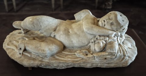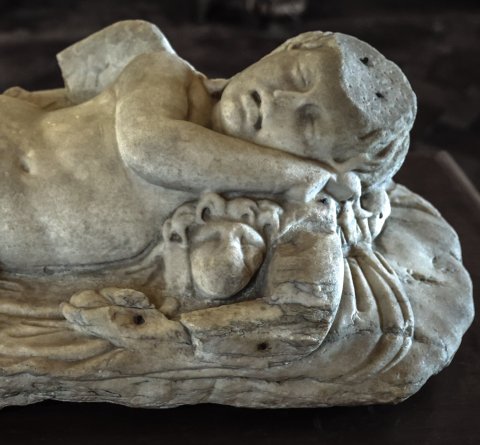 - mythische Figure: schlafender Amor (Erot), Kopf mit langen Locken liegt auf einem kleinen Löwen (Hund ?), in der linken Hand Mohnstängel (?).