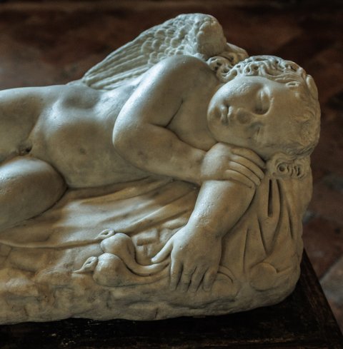 - Mythische Figur: schlafender Amot (Erot, Hypnos ?), liegt auf dem über Felsen gebreiteten Mantel, in der linken Hand Mohnstängel; am Fußende der Plinthe Eidechse.