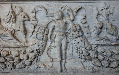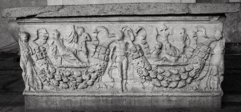 In den Girlandenbögen links gelagerter Dionysos und Pan, rechts Tropaion mit darunter kauernden Gefangenen und rechts davon stehendem nackten Jüngling.
