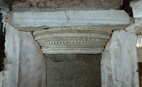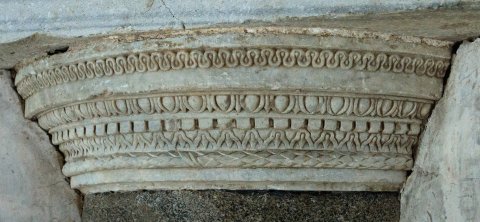- rundes Kapitell mit Lorbeerstab, Kyma, Zahnschnitt, Eierstab